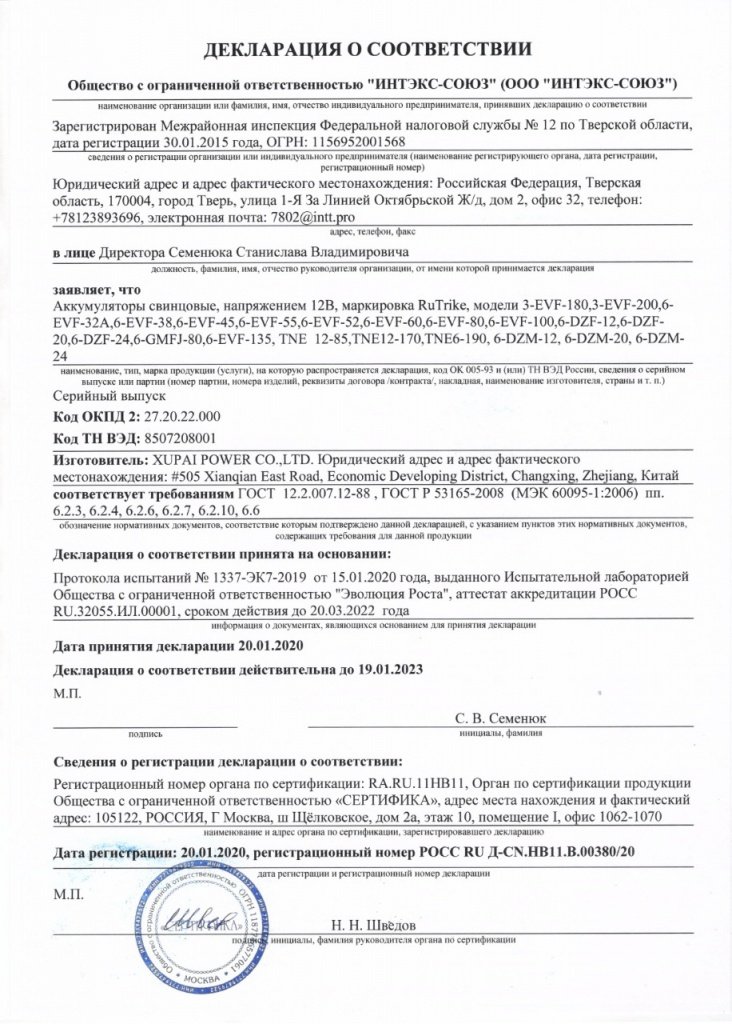 Аккумулятор RuTrike 6-EVF-100 изготовлена по технологии GEL (с гелеобразным кислотным электролитом) имеет длительный срок службы и предназначен для интенсивного использования. Высокая производительность при работе в глубоком цикле. Свинцовые пластины в виде решетки из особого сплава высокого качества, который защищает батарею от коррозии и снижает газовыделение. Специальная свинцовая паста высокой плотности позволяет работать до глубокого разряда, не снижая срок службы аккумулятора. Высокая надежность и безопасность: высокая прочность контейнера и крышки аккумулятора, изготовленных из АБС-пластика, оптимизированная модификация предохранительного клапана, надежные медные клеммы, проводящие ток большой силы – все это служит гарантией высокой надежности и безопасности эксплуатации в экстремальных условиях.