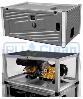 Конструктивное исполнение мойки - стационарный на раме. Силовой агрегат в сборе с насосом высокого давления установлен внутри металлической рамной конструкции. Однотипные аппараты возможно устанавливать в колонну друг на друга без дополнительных приспособлений, в результате достигается существенная экономия места в техническом помещении. Автомойка оснащена помпой с кривошипной передачей, с гибкой муфтой (повышенный ресурс) с защитой от гидроудара, так же в данной модели реализована водяная система охлаждения двигателя.
