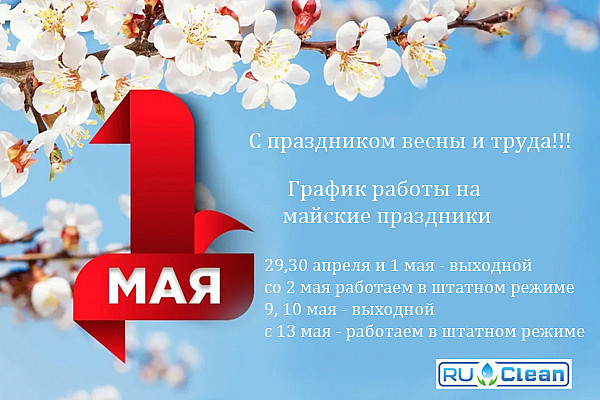 Поздравляем клиентов Ru-clean.ru и посетителей нашего сайта с праздниками 1-го Мая и Днем Великой Победы! Желаем Вам хорошо отдохнуть, чтобы после отлично потрудиться.