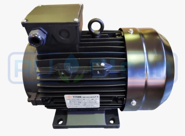 4-х полюсной асинхронный электромотор Titan мощностью 15 кВт, с частотой вращения ротора 1450 об/мин. Полый вал диаметром 24 мм, соединение валов по типу шпонка-паз. Конструктивное исполнение - горизонтальное с опорными лапами. Типоразмер H160.