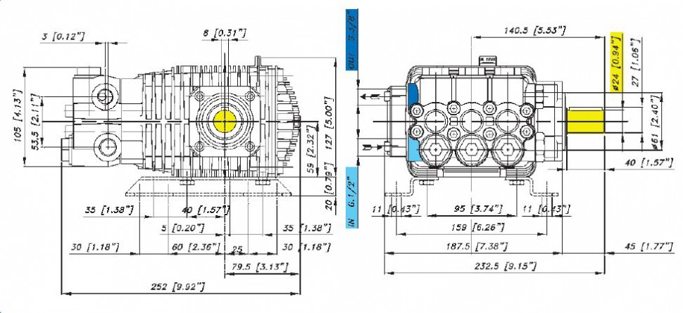 Плунжерный насос высокого давления с кривошипной передачей Bertolini TML 2420-HW. Номинальное давление 150 бар, расход воды 24,1 л/мин, частота вращения вала 1450 об/мин. Гладкий вал 24мм, шпонка.
