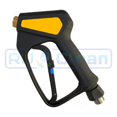 Максимальное давление 350бар, максимальная пропускная способность 45л/мин. Надежная и ударопрочная конструкция. Курок оснащен подключением со стандартной резьбой М22х1.5 с вращающимся фитингом. Вращающееся соединение не позволяет скручиваться шлангу, что значительно облегчает работу оператору моечной установки. Подходит к большенству профессиональных аппаратов высокого давления, представленных на рынках стран СНГ.