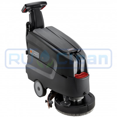Машина управляется пешим оператором и не оснащена приводом движения. Движение осуществляется за счет усилия толкания, а также за счет вращения щетки. Усилие толкания на ровной горизонтальной поверхности не превышает 2-3 кг. Электропитание осуществляется от аккумуляторных батарей, установленных на борту моечного агрегата. Машина полностью автономна: во время работы оператору не нужно отвлекаться и регулярно поправлять сетевой кабель. Бортовая сеть 12 В - один аккумулятор 12 В. Машина комплектуется тяговой аккумуляторной батареей литиевого типа. Емкость батареи 62 Ач (при С5), время работы от одного заряда порядка 1.5 часа.