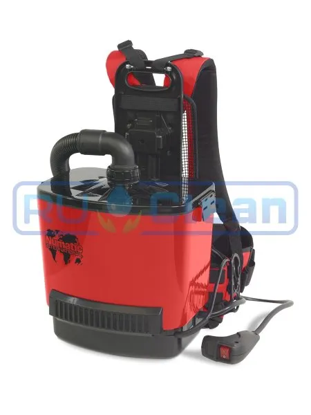 Ранцевый пылесос Numatic RSAV130-11 для уборки салонах самолетов. Пылесос удобен в ношении за счёт эргономичной ременной системы: плечевые лямки в сочетании с поясным ремнем. Система фильтрации Triplex - многоразовый фильтр корзинного типа. Электропитание от сети 110В, всасывающий мотор мощностью 960 Вт. Объем бака - 6 литров.